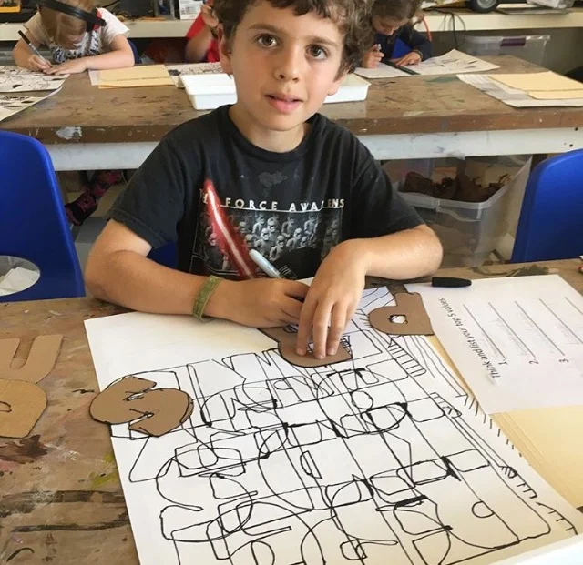 Inspired by the elaborately mechanized mini golf stations at Urban Putt, Fourth graders use their artistic and engineering skills to design their own high tech mini golf stations. The goals are for each station to have a ramp, a hole for the golf ball to go into, some peak created with the layering method, and obstacles that are created under a certain theme. They first created a mini model out of thin cardboard, then went onto the bigger cardboard for the final construction.